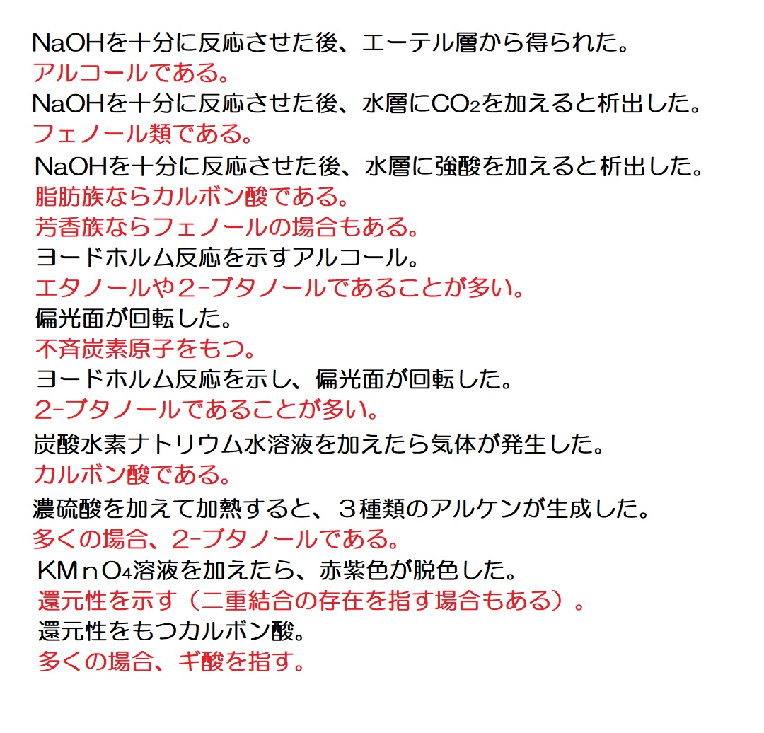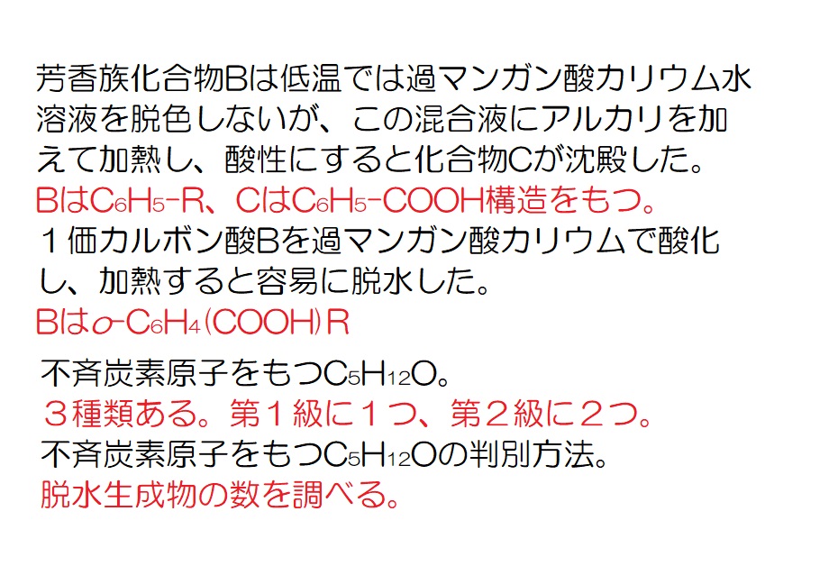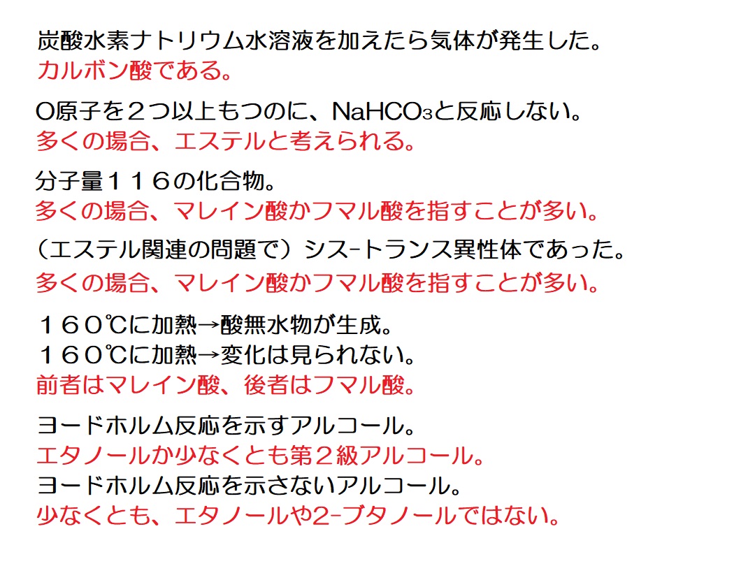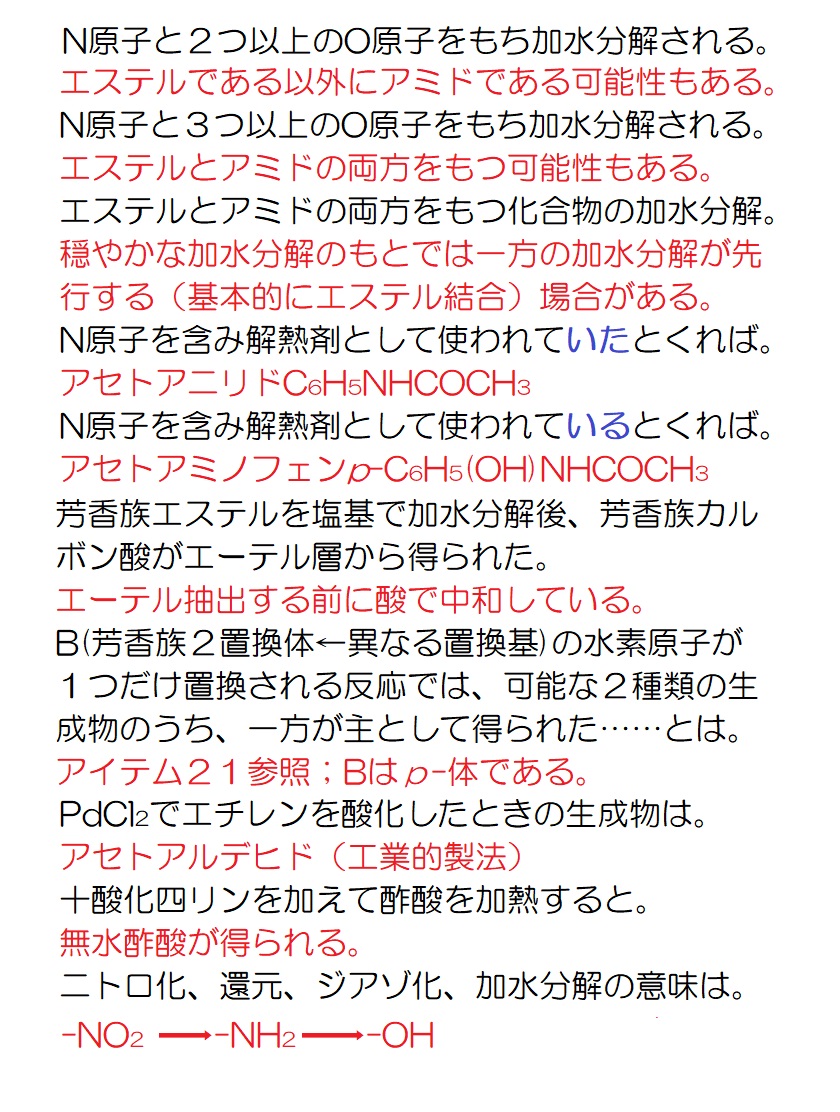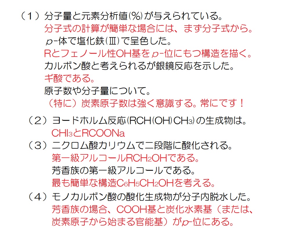 脂肪族の1問目←文章を読む練習 脂肪族の2問目←情報を整理し、文章を読む練習 油脂の1問目←典型的なパターンの油脂の出題例を解く練習 油脂の2問目←幾分か難解な油脂の問題に答えてしまう練習 芳香族の1問目←文章を読む練習 芳香族の2問目←詳細を読解して知識を確認する練習 芳香族の3問目←頻出分子式C7H8Oを利用して解答を導く練習 芳香族の4問目←頻出分子式C5H12Oが問われていることを確認     する練習 ペプチドの1問目←文章を読む練習 ペプチドの2問目←幾分か難解な問題を作表を活用して解く練習 ペプチドの3問目←典型的題材(アスパルテーム)の出題例の確認 ペプチドの4問目←典型的題材(エンケファリン)の出題例の確認