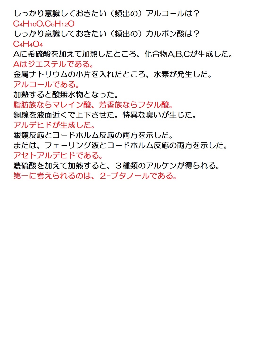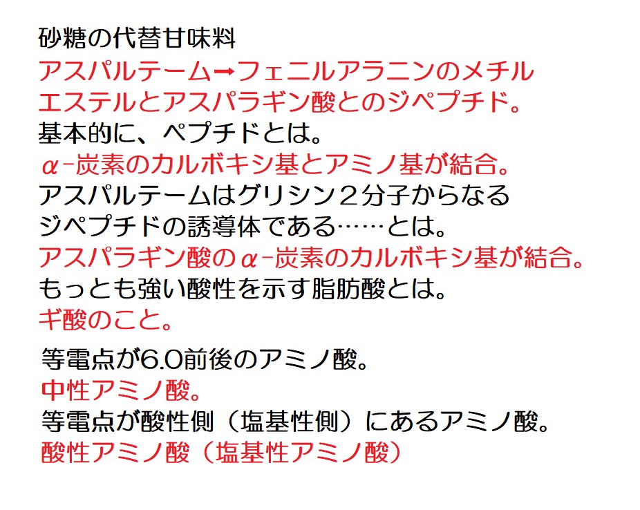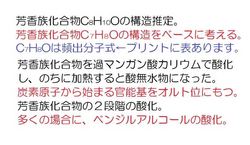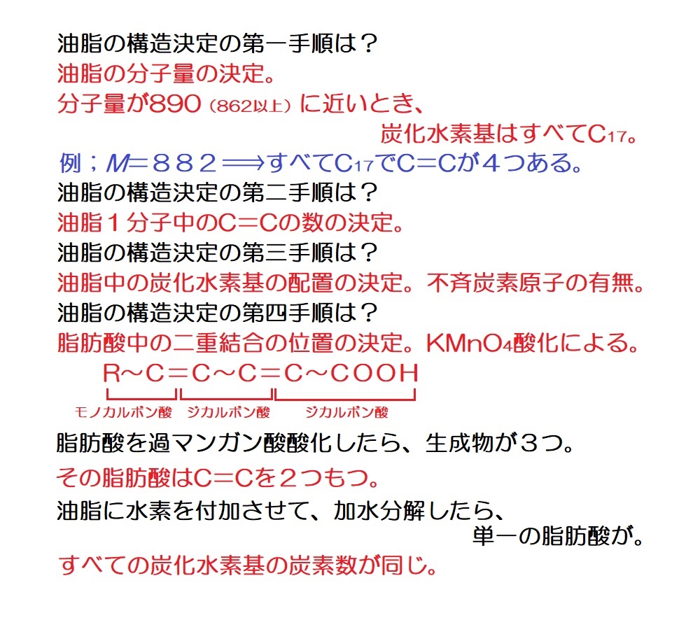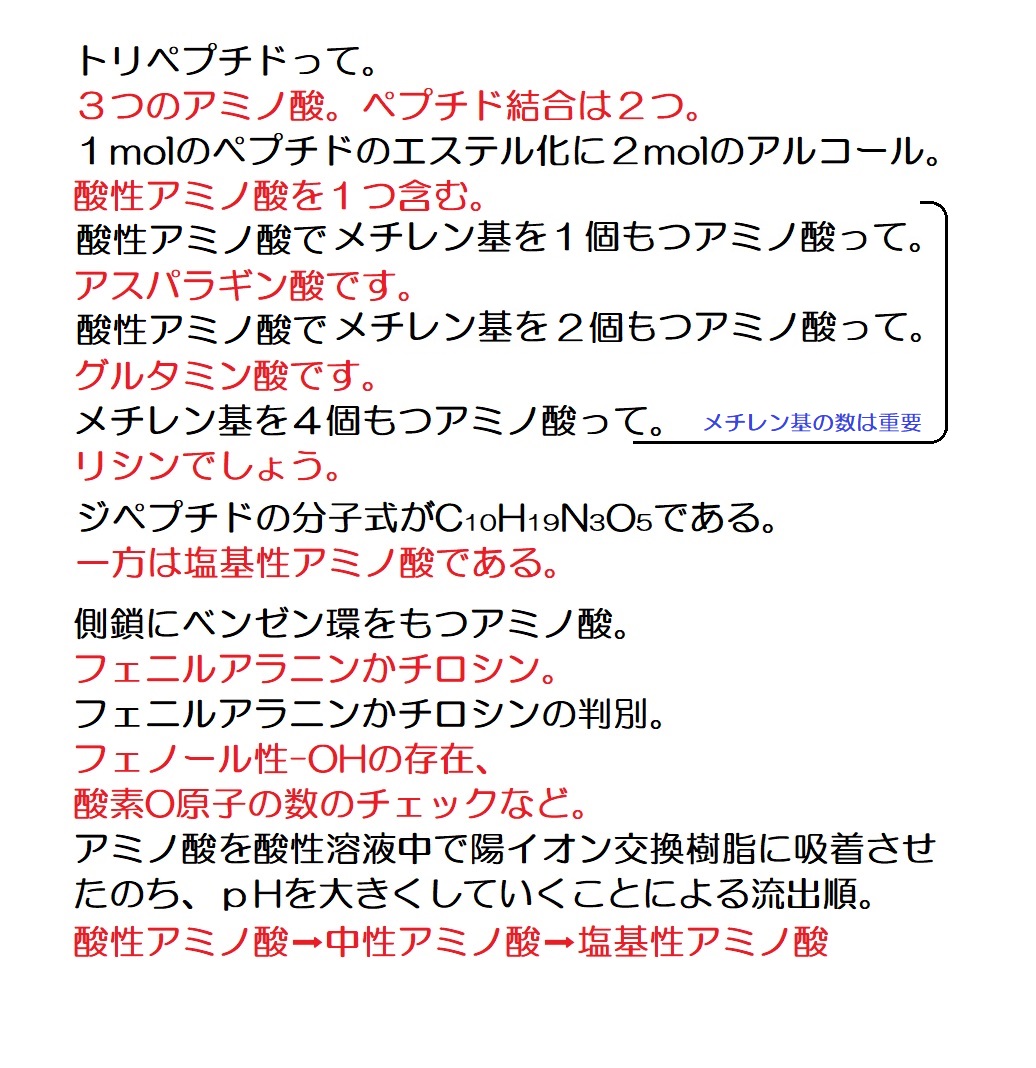 脂肪族の1問目←文章を読む練習 脂肪族の2問目←情報を整理し、文章を読む練習 油脂の1問目←典型的なパターンの油脂の出題例を解く練習 油脂の2問目←幾分か難解な油脂の問題に答えてしまう練習 芳香族の1問目←文章を読む練習 芳香族の2問目←詳細を読解して知識を確認する練習 芳香族の3問目←頻出分子式C7H8Oを利用して解答を導く練習 芳香族の4問目←頻出分子式C5H12Oが問われていることを確認     する練習 ペプチドの1問目←文章を読む練習 ペプチドの2問目←幾分か難解な問題を作表を活用して解く練習 ペプチドの3問目←典型的題材(アスパルテーム)の出題例の確認 ペプチドの4問目←典型的題材(エンケファリン)の出題例の確認